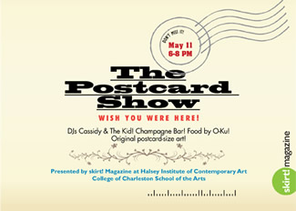 Inspired by the RCA Secret show held annually at the Royal College of Art in London, the Postcard Show is a one night exhibition of anonymously displayed 4 x 6 inch artwork. The identities of the postcard creators will only be revealed after ...a work is sold for the set price of $75. All proceeds will benefit the Skirt! Scholarship Fund at the College of Charleston.